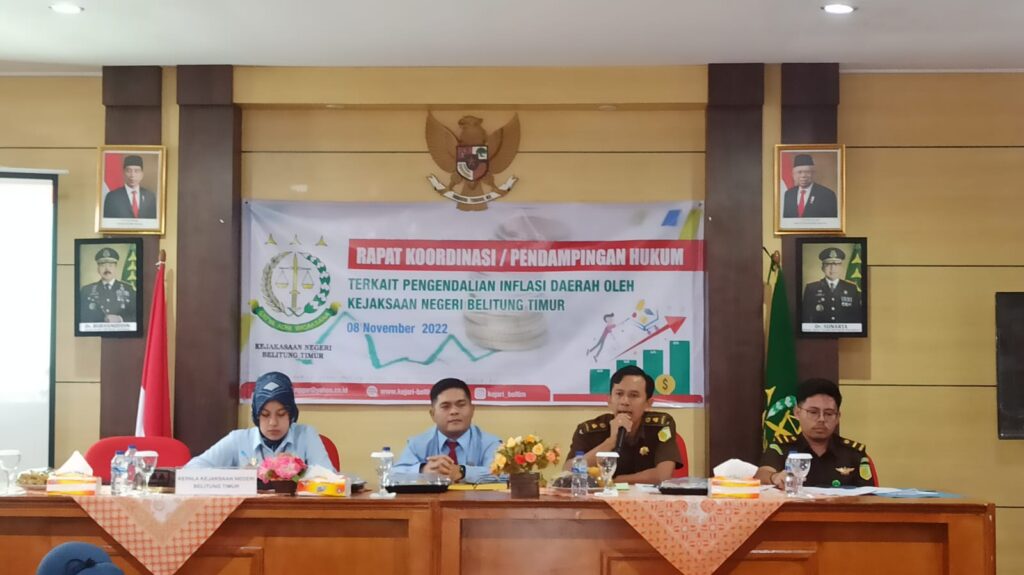 BELITUNG TIMUR – Pada hari Selasa, 08 November 2022 bertempat di Aula Kejaksaan Negeri Belitung Timur telah dilaksanakan Rapat Koordinasi Pengendalian Inflasi Daerah yang dihadiri oleh Bupati Belitung Timur Drs. Burhanuddin, Kepala Kejaksaan Negeri Belitung Timur Dr. Abdur Kadir, SH.MH, Ketua DPRD Belitung Timur Fezzi Uktolseja, SE.MM, Kapolres Belitung Timur yang diwakili Kasat Intelkam Iptu Rizky Yanuar Hernanda, Dandim 0414 Belitung yang diwakili Pabung Kodim Mayor Inf Joko Lelono, Danpos AL Manggar, Danpos AU Manggar, Kasi Intelijen Yoyok Junaidi, SH, Kasi Pidana Umum Dody Prihatman Purba,SH, Kepala Seksi Perdata dan Tata Usaha Negara Baniara Mangapul Sinaga, SH,MH , Asisten Bidang Ekonomi, Sekretaris Daerah, Camat dan Kepala Desa se-Kabupaten Belitung Timur.