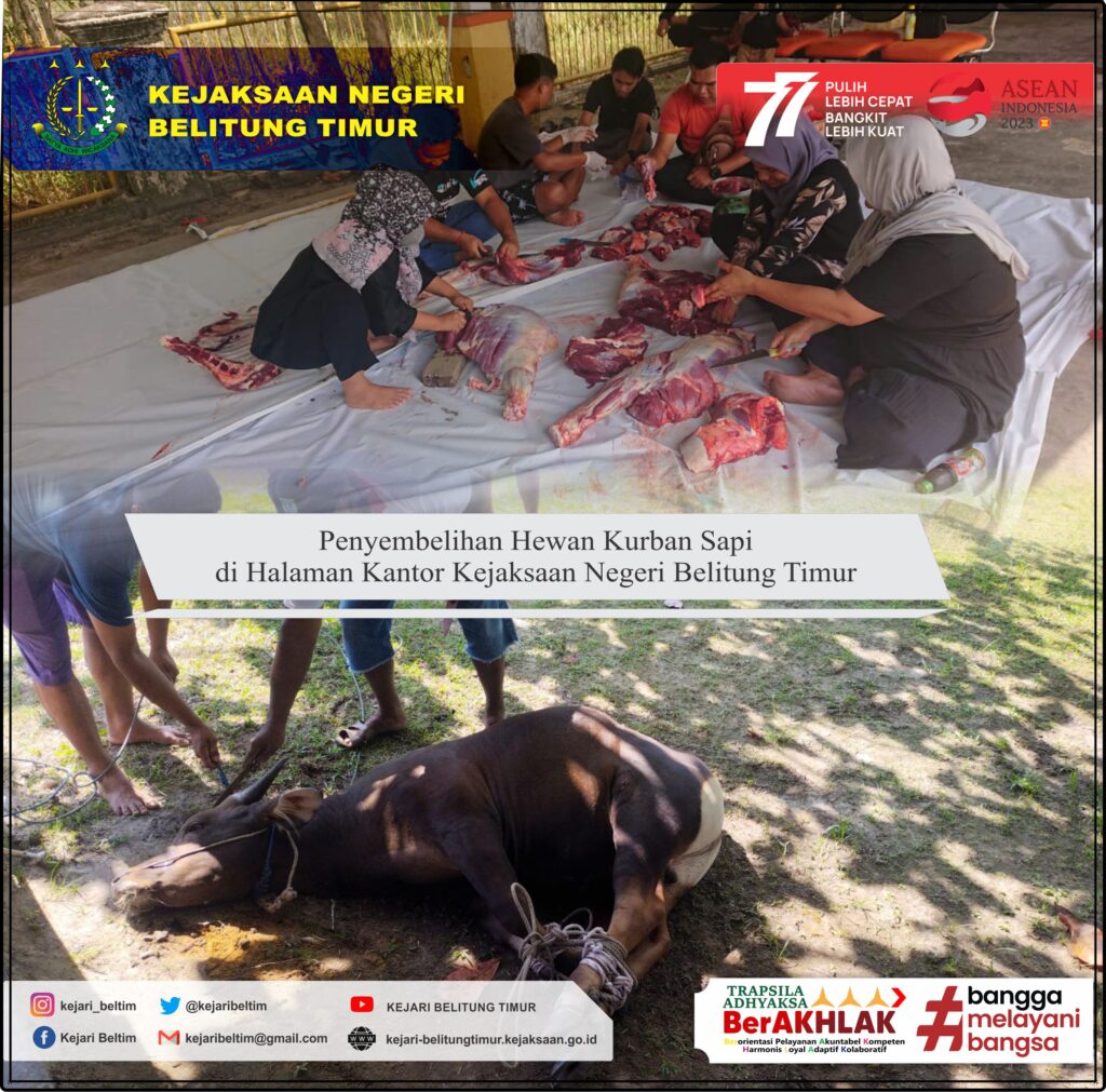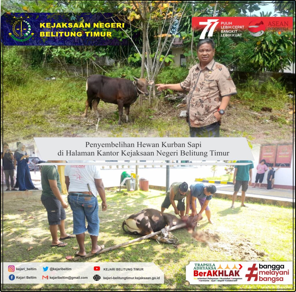 Alhamdulillah Kejaksaan Negeri Belitung Timur dapat mengadakan penyembelihan hewan kurban Sapi yang diadakan pada hari Kamis, 29 Juni 2023. 1 hewan kurban dari 7 shohibul kurban, penyembelihan hewan kurban tersebut bertempat di halaman Kantor Kejaksaan Negeri Belitung Timur.