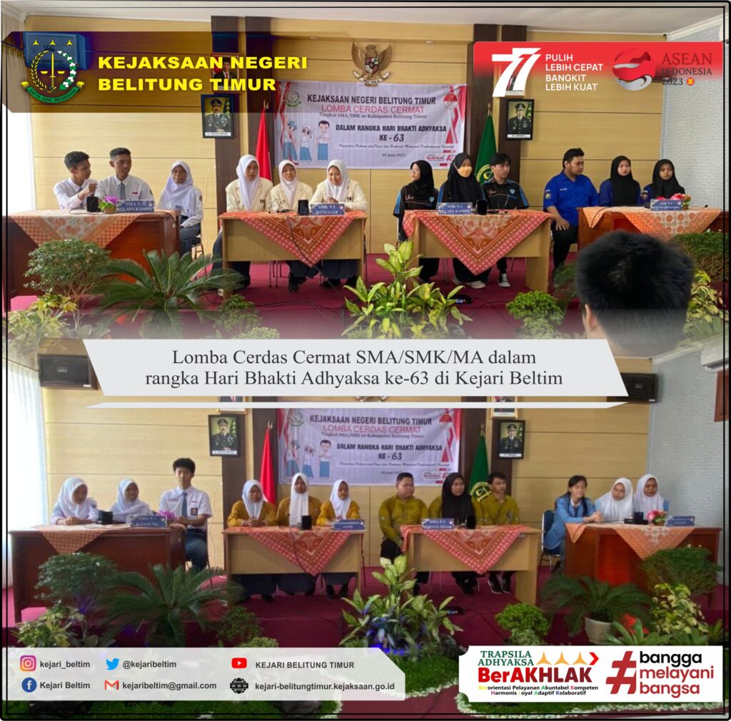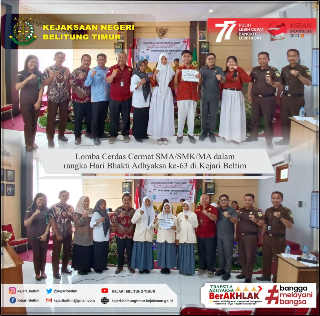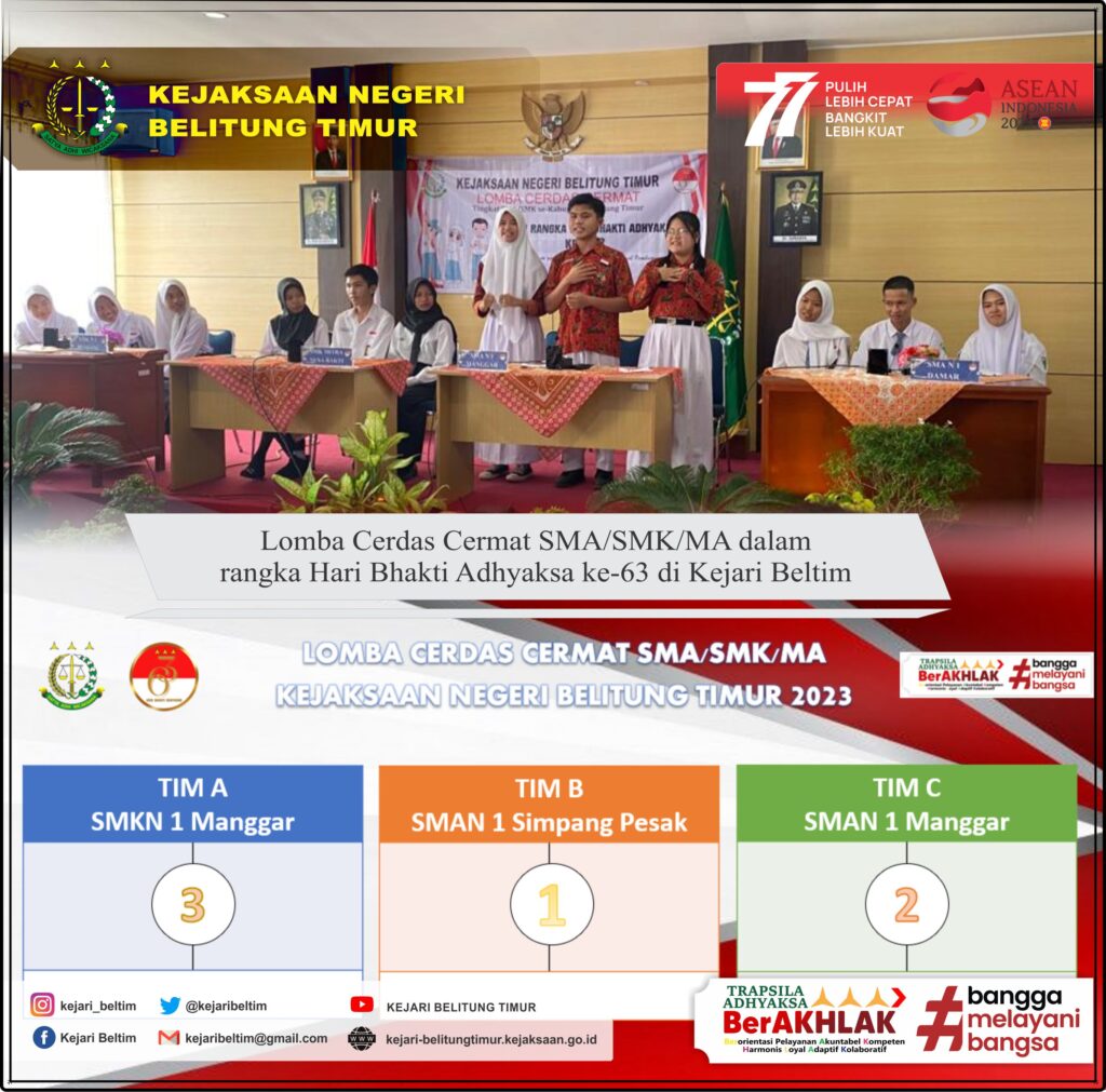 Rabu, 05 Juli 2023 – Lomba Cerdas Cermat SMA/SMK/MA se Kab. Beltim, diikuti oleh 12 Sekolahan yang dimenangkan oleh SMAN 1 Simpang Pesak Juara 1, SMAN 1 Manggar Juara 2 dan SMKN 1 Manggar Juara 3 diadakan di aula Kejaksaan Negeri Belitung Timur yang terlaksana dengan meriah.