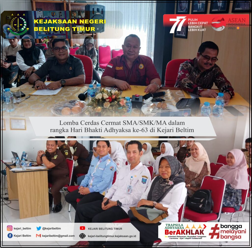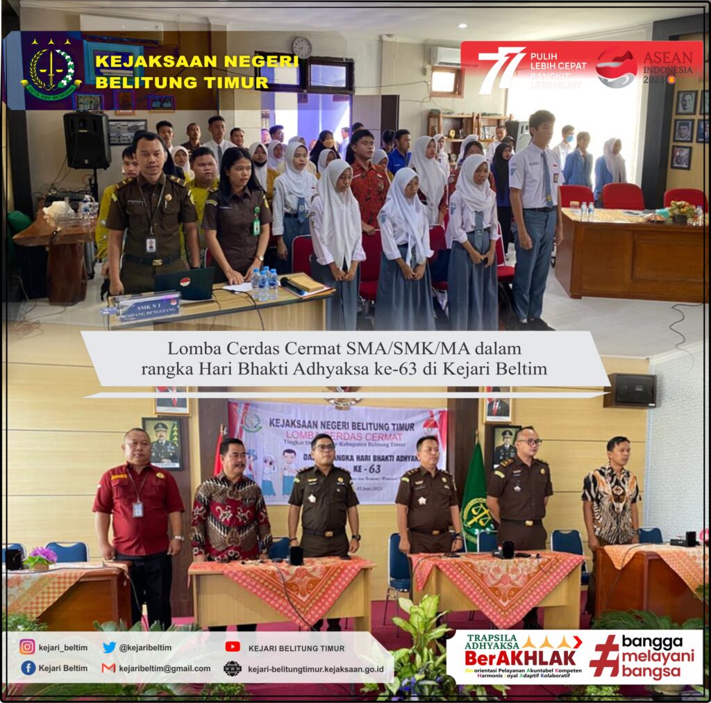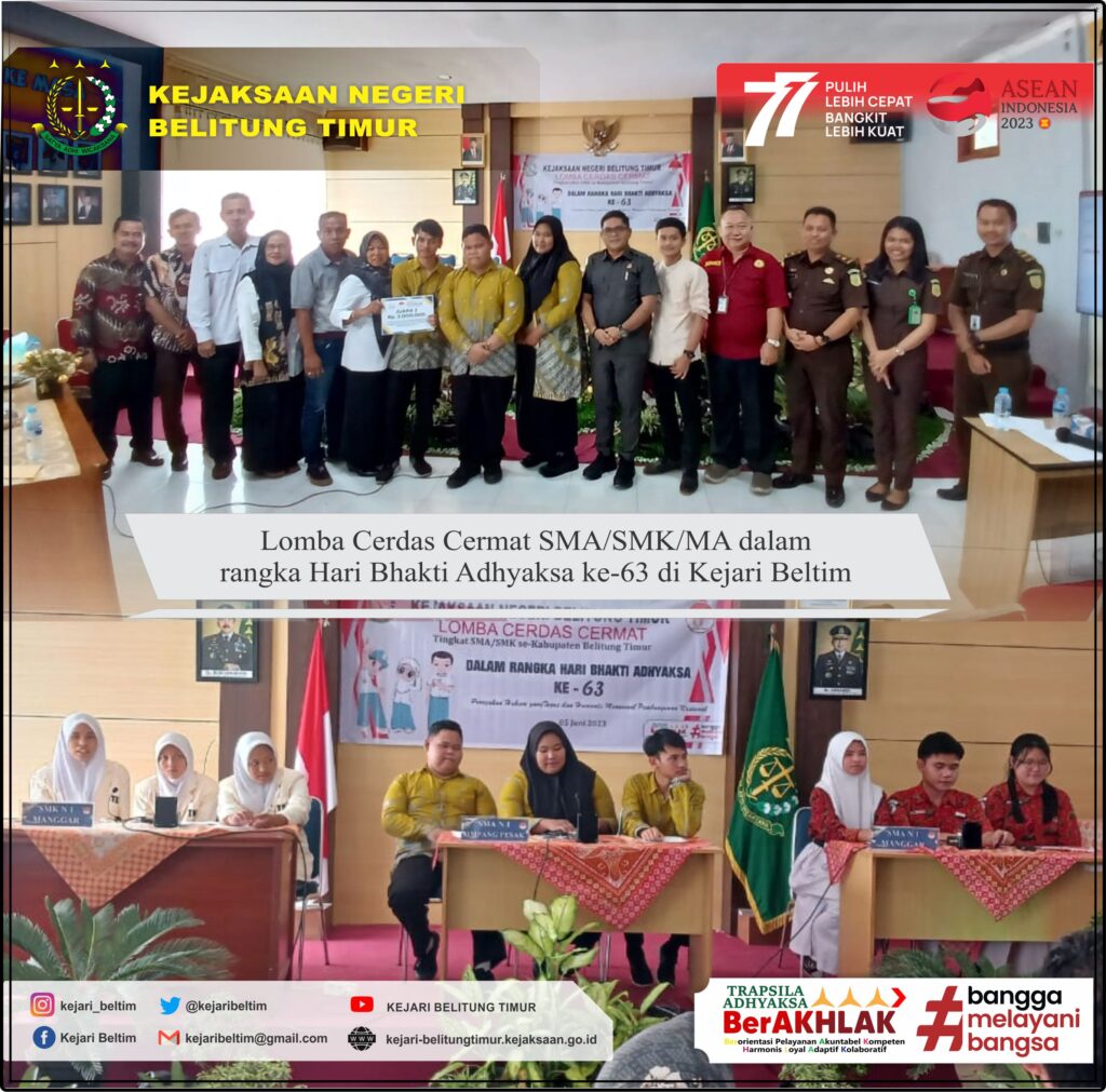 Rabu, 05 Juli 2023 – Lomba Cerdas Cermat SMA/SMK/MA se Kab. Beltim, diikuti oleh 12 Sekolahan yang dimenangkan oleh SMAN 1 Simpang Pesak Juara 1, SMAN 1 Manggar Juara 2 dan SMKN 1 Manggar Juara 3 diadakan di aula Kejaksaan Negeri Belitung Timur yang terlaksana dengan meriah.