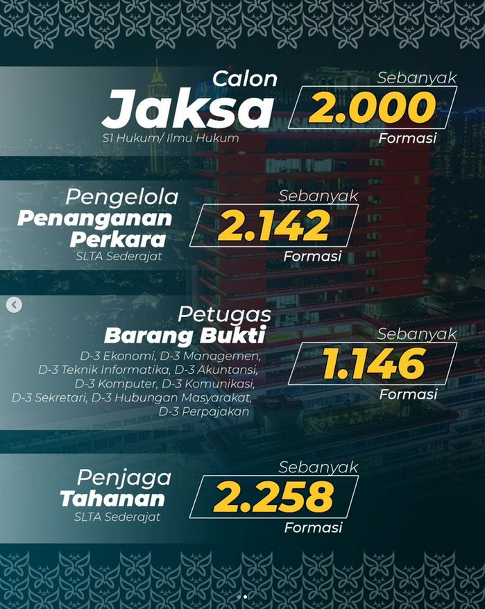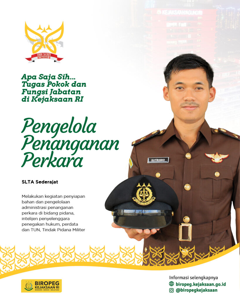 Sobat Adhyaksa, bagi kalian yang berminat untuk menjadi bagian dari penegakan hukum yang humanis dibawah kepemimpinan Jaksa Agung, persiapkan diri kalian… karena telah ditetapkan pengadaan Calon Pegawai Negeri Sipil (CPNS) di lingkungan Kejaksaan RI sebanyak 7.846 formasi pada 4 jenis jabatan…
