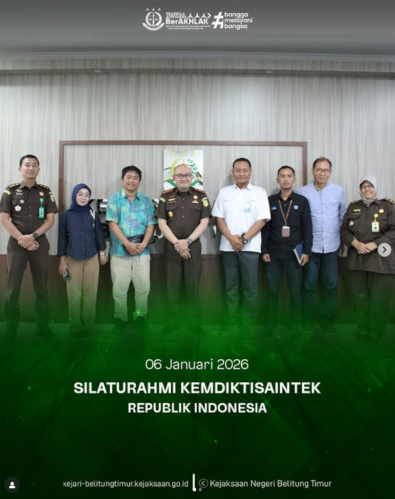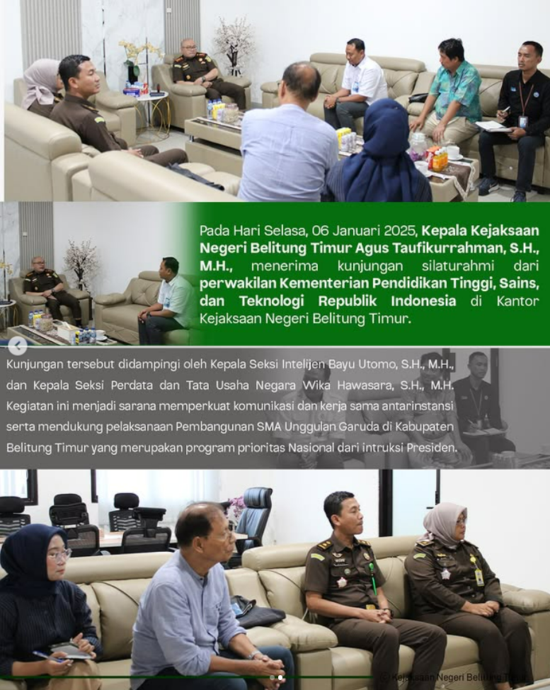 Pada Hari Selasa, 06 Januari 2025, Kepala Kejaksaan Negeri Belitung Timur Agus Taufikurrahman, S.H., M.H., menerima kunjungan silaturahmi dari perwakilan Kementerian Pendidikan Tinggi, Sains, dan Teknologi Republik Indonesia di Kantor Kejaksaan Negeri Belitung Timur.