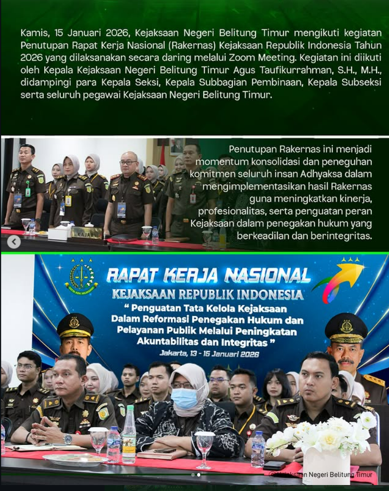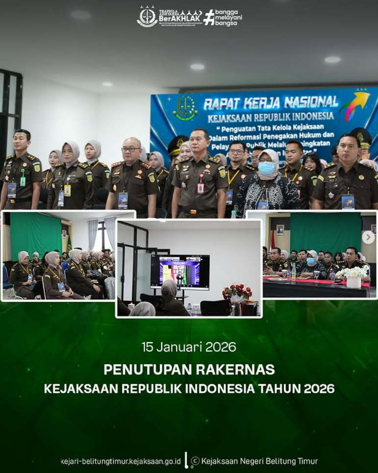 Kamis, 15 Januari 2026, Kejaksaan Negeri Belitung Timur mengikuti kegiatan Penutupan Rapat Kerja Nasional (Rakernas) Kejaksaan Republik Indonesia Tahun 2026 yang dilaksanakan secara daring melalui Zoom Meeting.