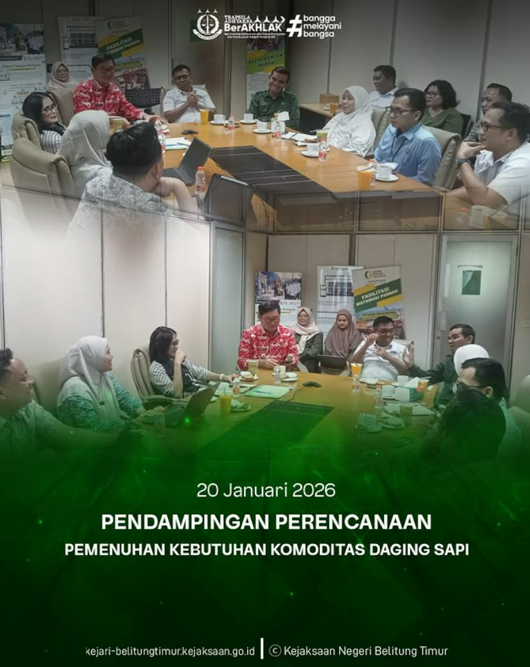 Selasa, 20 Januari 2026, Kejaksaan Negeri Belitung Timur melaksanakan kegiatan Pendampingan Perencanaan Pemenuhan Kebutuhan Komoditas Daging Sapi dalam rangka menyambut Perayaan Hari Raya Idul Fitri 1447 Hijriah Tahun 2026. Kegiatan ini dilaksanakan di Kantor Badan Pangan Nasional, Jakarta.