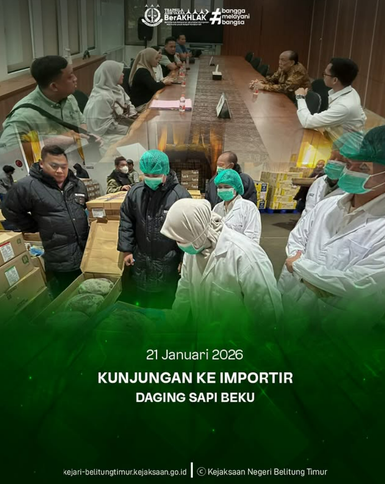 Rabu, 21 Januari 2026, Kejaksaan Negeri Belitung Timur mengikuti kegiatan Kunjungan ke Importir Daging Sapi Beku yang dilaksanakan di PT Indoguna Utama, Jakarta Timur. Kegiatan ini dihadiri oleh Jaksa Fungsional Bidang Perdata dan Tata Usaha Negara, Imantaka Adhi Nur Lafinda, S.H., bersama Organisasi Perangkat Daerah (OPD) Kabupaten Belitung Timur. Kunjungan ini bertujuan untuk memperoleh informasi serta pemahaman terkait proses pengadaan dan distribusi daging sapi beku, sebagai bagian dari upaya mendukung penguatan koordinasi dan pendampingan hukum dalam pemenuhan kebutuhan pangan daerah.