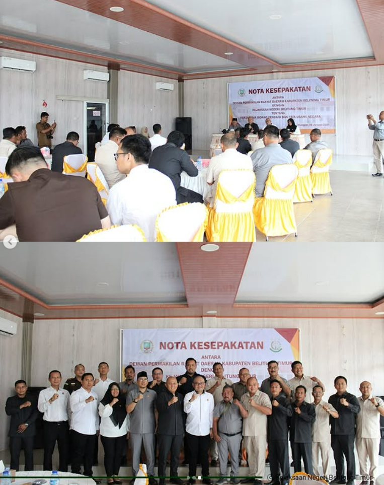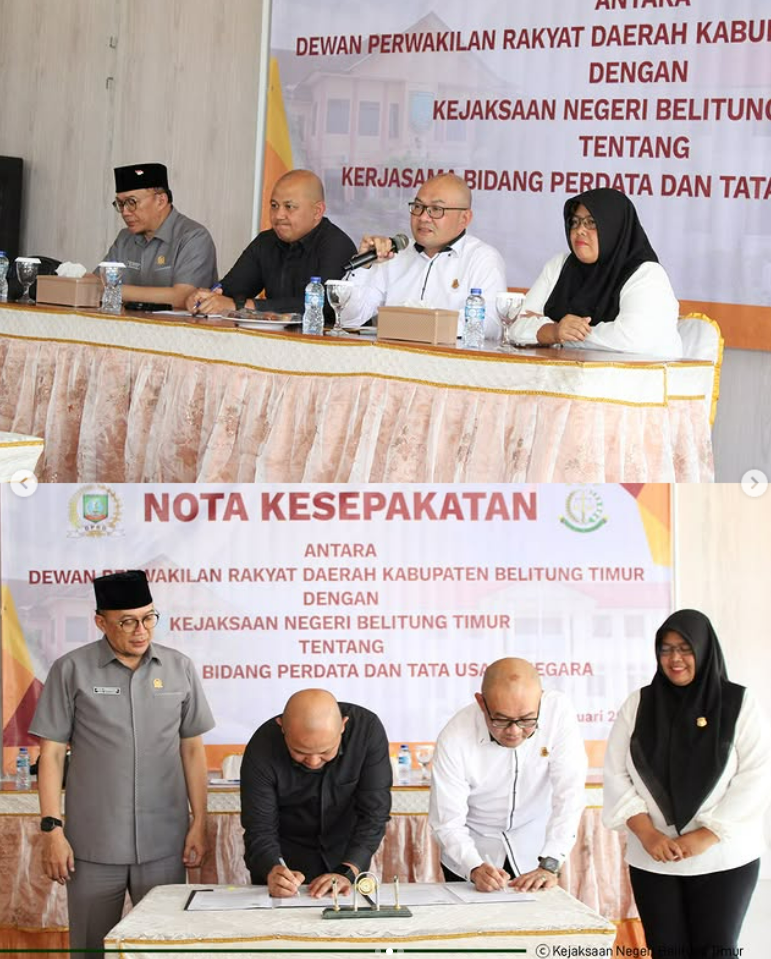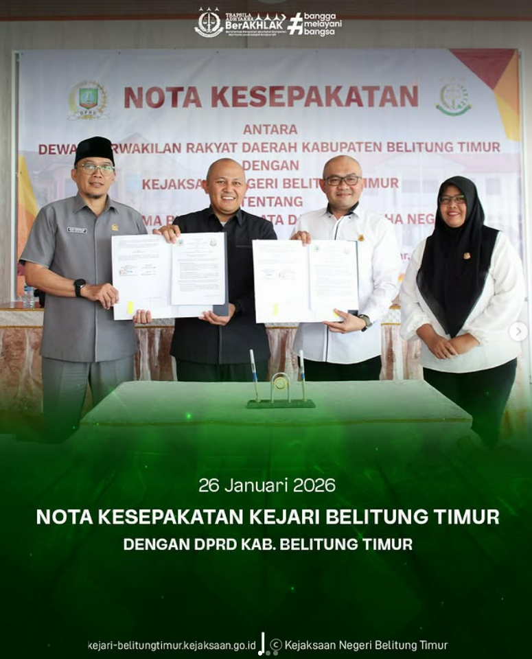 Senin, 26 Januari 2026, Kejaksaan Negeri Belitung Timur bersama Dewan Perwakilan Rakyat Daerah Kabupaten Belitung Timur melaksanakan Nota Kesepakatan tentang kerja sama di bidang Perdata dan Tata Usaha Negara.
