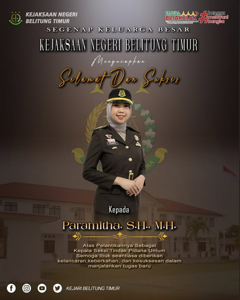 “SELAMAT DAN SUKSES” Kepada Paramitha, S.H., M.H. Atas Pelantikannya Sebagai Kepala Seksi Tindak Pidana Umum, Semoga Ibu Senantiasa Diberikan Kelancaran, Keberkahan Dan Kesuksesan Dalam Menjalankan Tugas Baru Di Kejakasaan Negeri Belitung Timur.