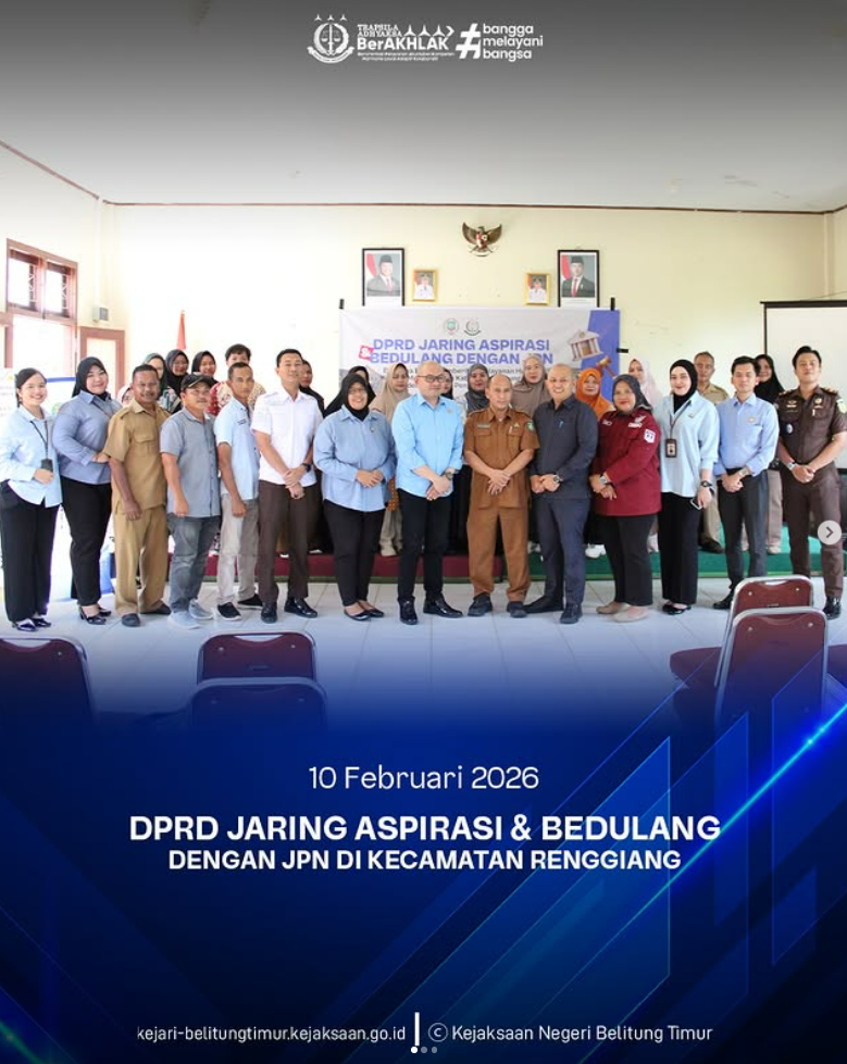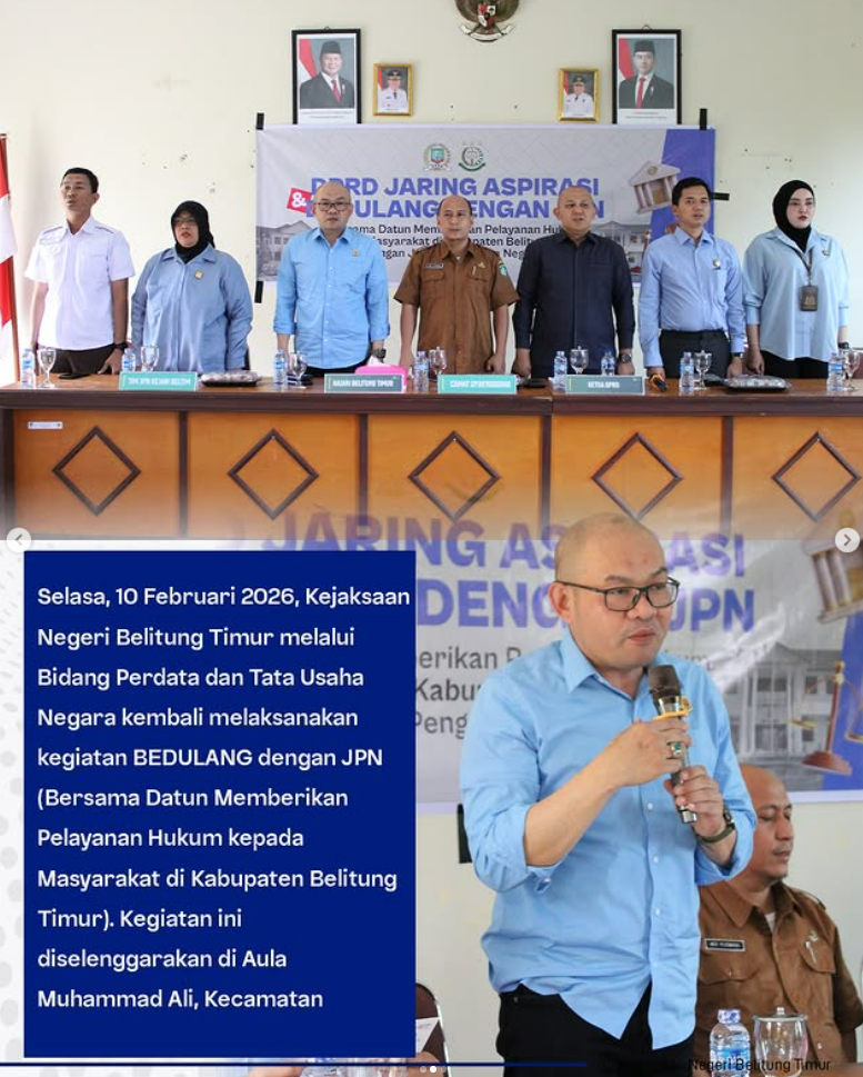 Selasa, 10 Februari 2026, Kejaksaan Negeri Belitung Timur melalui Bidang Perdata dan Tata Usaha Negara kembali melaksanakan kegiatan BEDULANG dengan JPN (Bersama Datun Memberikan Pelayanan Hukum kepada Masyarakat di Kabupaten Belitung Timur). Kegiatan ini diselenggarakan di Aula Muhammad Ali, Kecamatan Simpang Renggiang.