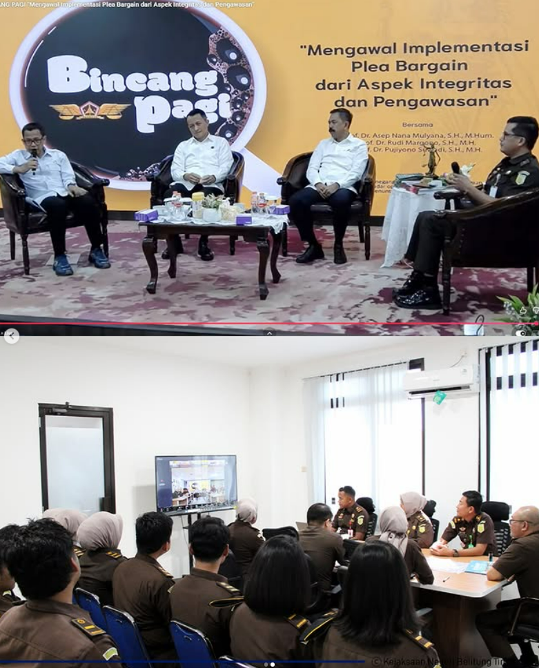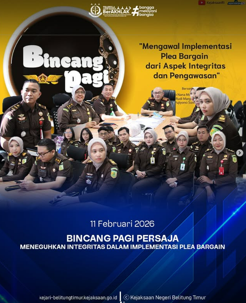 Rabu, 11 Februari 2026, Kejaksaan Negeri Belitung Timur mengikuti kegiatan Bincang Pagi bersama PERSAJA yang dilaksanakan secara daring melalui Zoom Meeting dengan tema “Mengawal Implementasi Plea Bargain dari Aspek Integritas dan Pengawasan”.