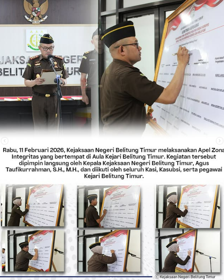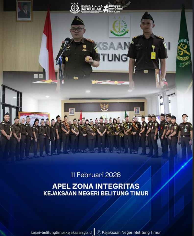 Rabu, 11 Februari 2026, Kejaksaan Negeri Belitung Timur melaksanakan Apel Zona Integritas yang bertempat di Aula Kejari Belitung Timur. Kegiatan tersebut dipimpin langsung oleh Kepala Kejaksaan Negeri Belitung Timur, Agus Taufikurrahman, S.H., M.H., dan diikuti oleh seluruh Kasi, Kasubsi, serta pegawai Kejari Belitung Timur.