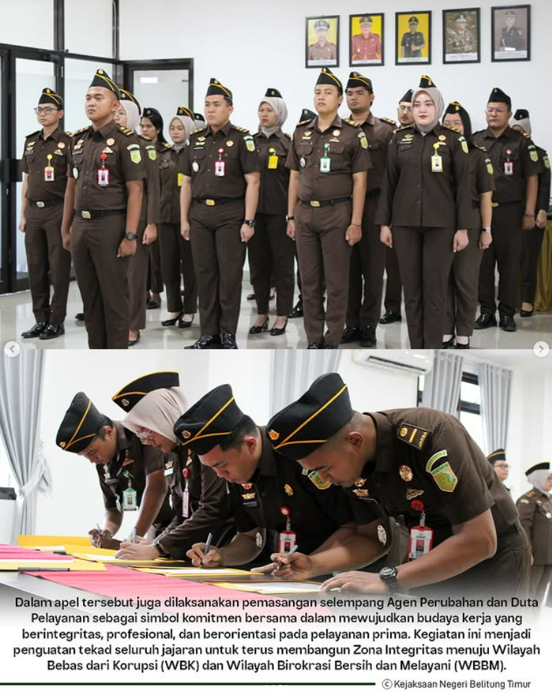 Dalam apel tersebut juga dilaksanakan pemasangan selempang Agen Perubahan dan Duta Pelayanan sebagai simbol komitmen bersama dalam mewujudkan budaya kerja yang berintegritas, profesional, dan berorientasi pada pelayanan prima. Kegiatan ini menjadi penguatan tekad seluruh jajaran untuk terus membangun Zona Integritas menuju Wilayah Bebas dari Korupsi (WBK) dan Wilayah Birokrasi Bersih dan Melayani (WBBM).