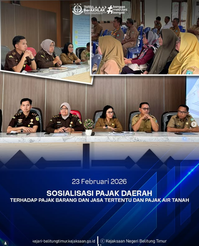 Senin, 23 Februari 2026, Jaksa Pengacara Negara Kejaksaan Negeri Belitung Timur melaksanakan kegiatan Sosialisasi Pajak Daerah terhadap Pajak Barang dan Jasa Tertentu serta Pajak Air Tanah bersama Badan Pengelolaan Keuangan dan Pendapatan Daerah serta Satuan Pamong Praja dan Camat Gantung di Aula Kantor Camat Gantung, Kabupaten Belitung Timur.
