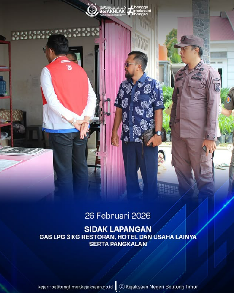 Kamis, 26 Februari 2026, Kejaksaan Negeri Belitung Timur mengikuti kegiatan inspeksi mendadak (sidak) lapangan pada restoran, hotel, pangkalan, serta sejumlah pelaku usaha lainnya bersama Wakil Bupati Kabupaten Belitung Timur, PT Pertamina Patra Niaga Regional II Wilayah Belitung, serta instansi pemerintah terkait.