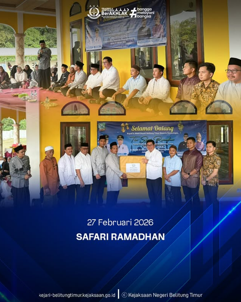 Jum’at, 27 Februari 2026, Kejaksaan Negeri Belitung Timur mengikuti kegiatan Safari Ramadhan yang diselenggarakan di Masjid Al-Absor. Kegiatan penuh makna ini dihadiri oleh Bupati dan Wakil Bupati Kabupaten Belitung Timur, jajaran Forkopimda, serta para pejabat instansi terkait lainnya.