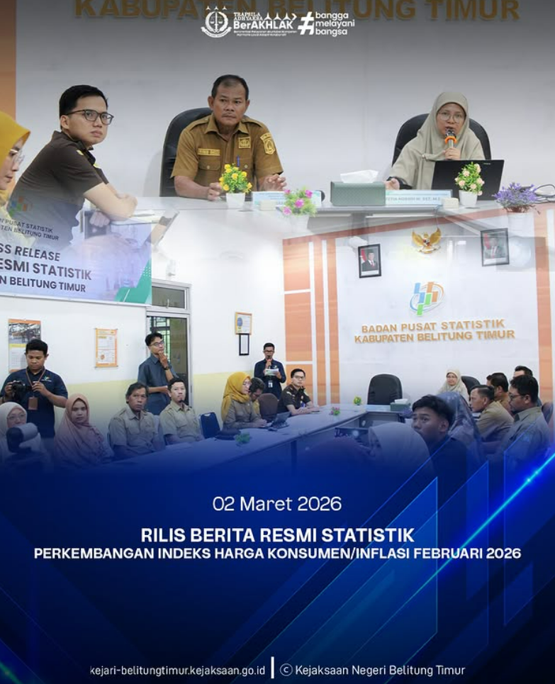 Senin, 02 Maret 2026, Kejaksaan Negeri Belitung Timur menghadiri kegiatan Rilis Berita Resmi Statistik (BRS) Perkembangan Indeks Harga Konsumen/Inflasi Bulan Februari 2026 yang dilaksanakan di Ruang Pertemuan Badan Pusat Statistik (BPS) Kabupaten Belitung Timur.