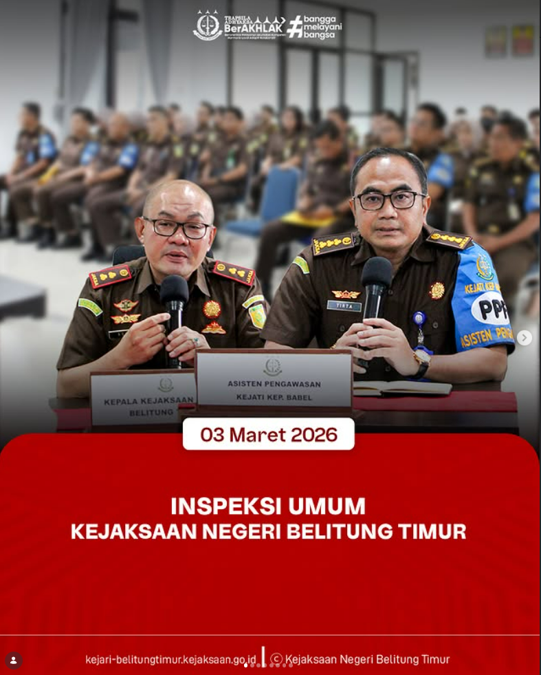 Pada hari Selasa, 03 Maret 2026, Kejaksaan Negeri Belitung Timur menerima kunjungan Inspeksi Umum dari Asisten Bidang Pengawasan Kejaksaan Tinggi Kepulauan Bangka Belitung, Dr. Endang Tirtana, S.H., M.H., beserta tim pemeriksa dan auditor.