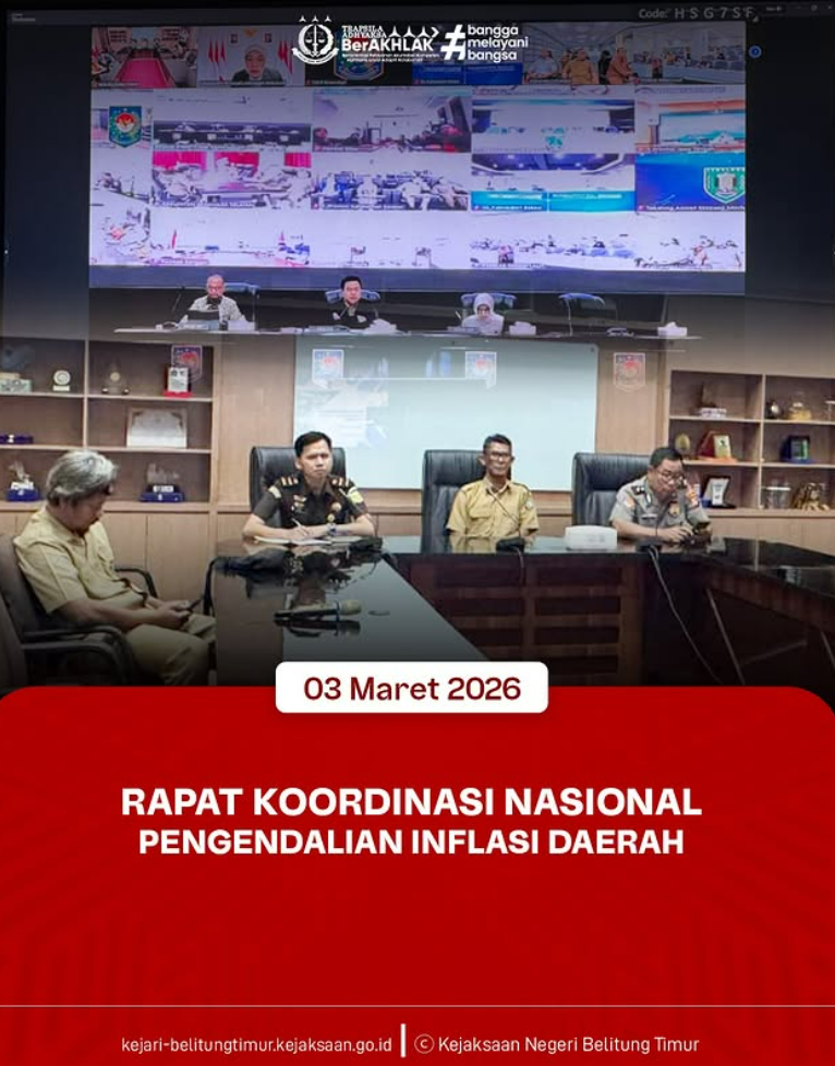 Selasa, 03 Maret 2026, Kejaksaan Negeri Belitung Timur menghadiri Rapat Koordinasi Evaluasi Langkah Konkret Pengendalian Inflasi Daerah Tahun 2026 di Kabupaten Belitung Timur yang dilaksanakan secara hybrid melalui Zoom Meeting dan bertempat di Ruang Rapat Bupati Belitung Timur.