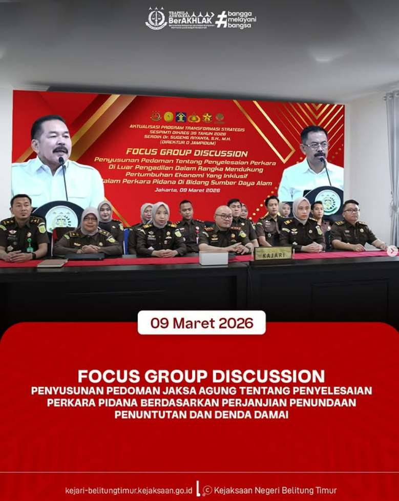 Senin, 09 Maret 2026 — Kepala Kejaksaan Negeri Belitung Timur beserta jajaran mengikuti Zoom Focus Group Discussion (FGD) terkait pembahasan penyusunan Pedoman Jaksa Agung tentang Penyelesaian Perkara Pidana Berdasarkan Perjanjian Penundaan Penuntutan dan Denda Damai.