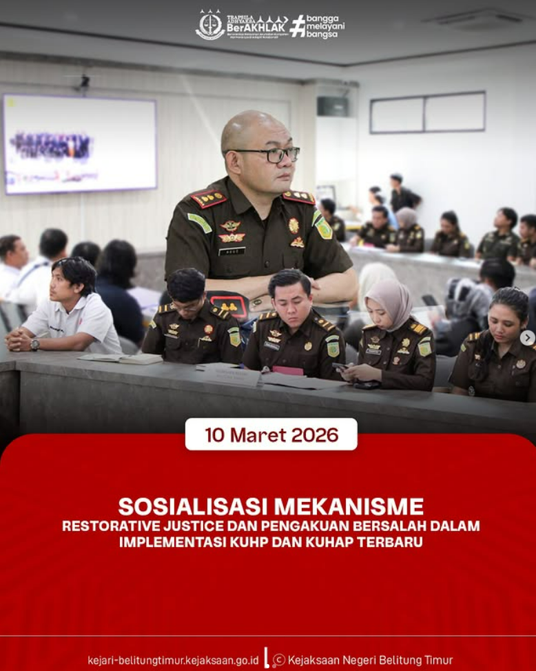 Selasa, 10 Maret 2026, Kepala Kejaksaan Negeri Belitung Timur Agus Taufikurrahman, S.H., M.H., bersama Kepala Seksi Tindak Pidana Umum, Kasubsi, serta Jaksa Fungsional mengikuti kegiatan Sosialisasi Mekanisme Restorative Justice dan Pengakuan Bersalah dalam Implementasi KUHP dan KUHAP Terbaru yang dilaksanakan di Pengadilan Negeri Tanjungpandan, Kabupaten Belitung.