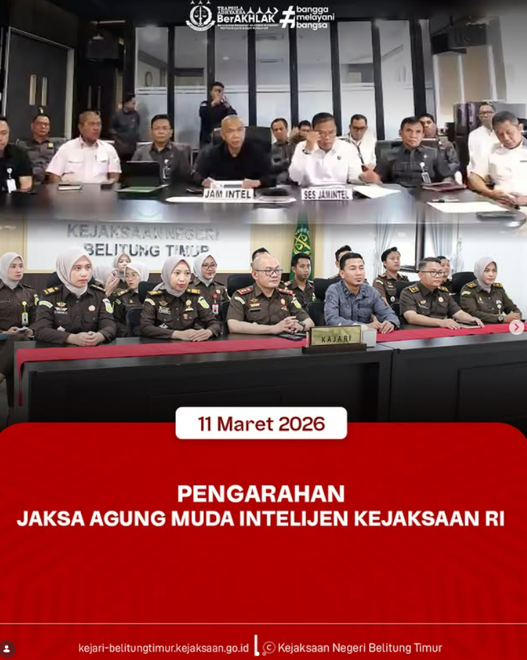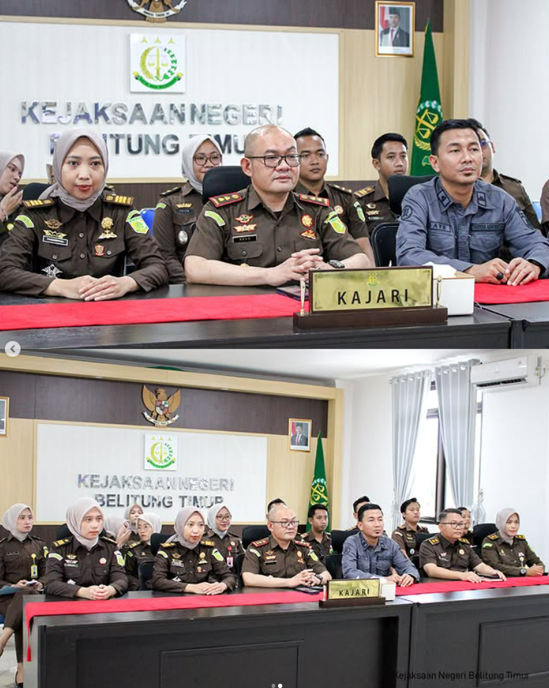 Kepala Kejaksaan Negeri Belitung Timur Agus Taufikurrahman, S.H., M.H. bersama para Kepala Seksi, Kepala Sub Seksi, serta seluruh pegawai Kejaksaan Negeri Belitung Timur mengikuti kegiatan pengarahan dari Jaksa Agung Muda Intelijen dalam rangka persiapan menghadapi libur dan cuti bersama Hari Raya Nyepi (Tahun Baru Saka 1948) serta Hari Raya Idul Fitri 1447 H.