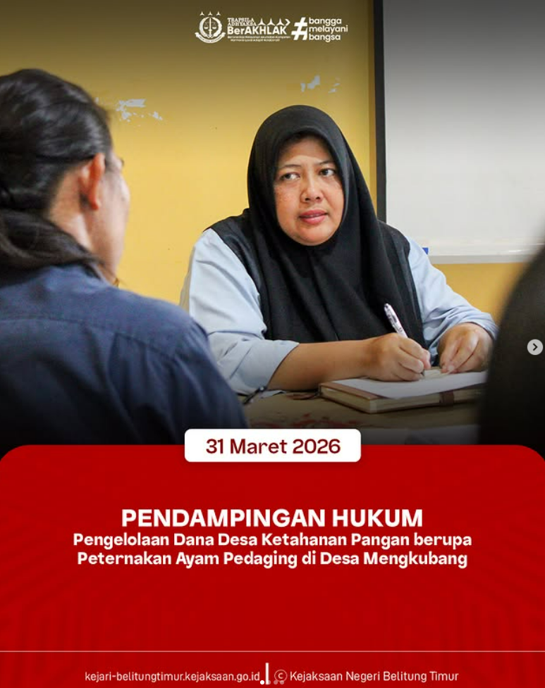 Selasa, 31 Maret 2026 Kejaksaan Negeri Belitung Timur mengikuti Rapat Pendampingan Hukum Kegiatan Ketahanan Pangan Di Desa Mengkubang Kecamatan Damar. Kegiatan ini Bersama dengan Dinas Pemberdayaan Masyarakat dan Desa, Pengendalian Penduduk dan Keluarga Berencana Kabupaten Belitung Timur dan dihadiri oleh Jaksa Pengacara Negara Kejari Beltim Sebagai bentuk dukungan terhadap pelaksanaan program ketahanan pangan di wilayah Belitung Timur.