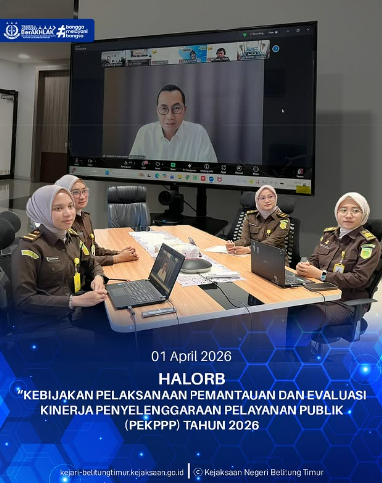 Rabu, 01 April 2026, Kejaksaan Negeri Belitung Timur mengikuti kegiatan HaloRb dengan tema “Kebijakan Pelaksanaan Pemantauan dan Evaluasi Kinerja Penyelenggaraan Pelayanan Publik (PEKPPP) Tahun 2026” yang dilaksanakan secara daring melalui Zoom Meeting dari Ruang Rapat Kejari Belitung Timur.