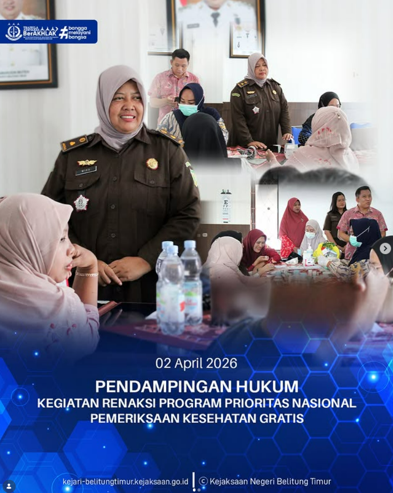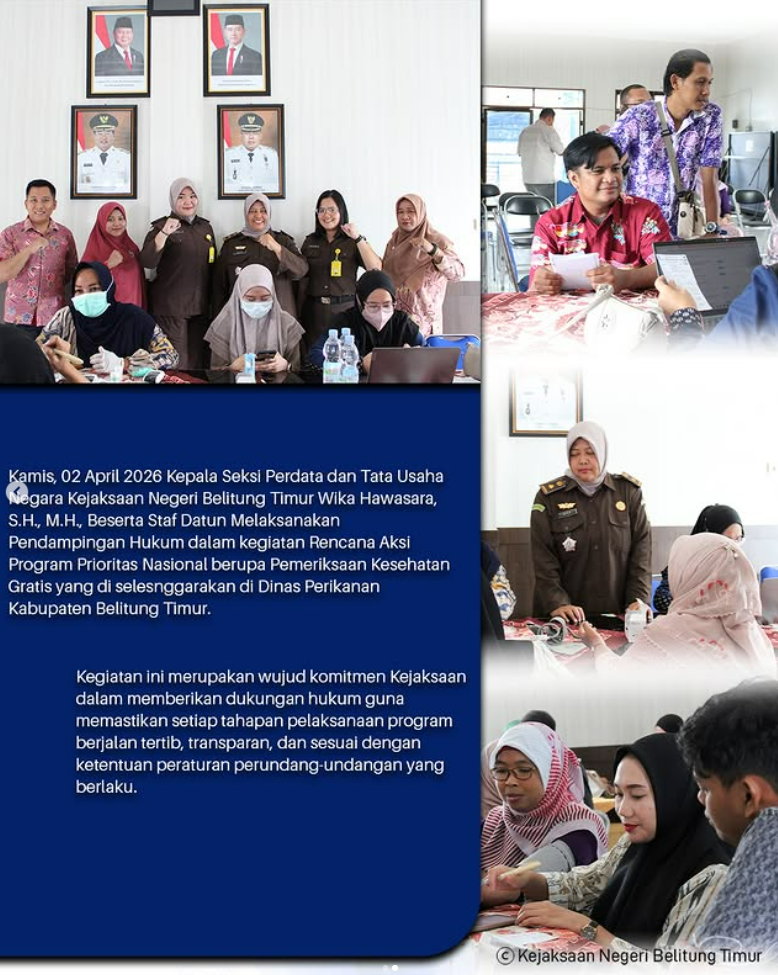 Kamis, 02 April 2026 Kepala Seksi Perdata dan Tata Usaha Negara Kejaksaan Negeri Belitung Timur Wika Hawasara, S.H., M.H., Beserta Staf Datun melaksanakan pendampingan hukum dalam kegiatan Rencana Aksi Program Prioritas Nasional berupa Pemeriksaan Kesehatan Gratis yang diselenggarakan di Dinas Perikanan Kabupaten Belitung Timur.
