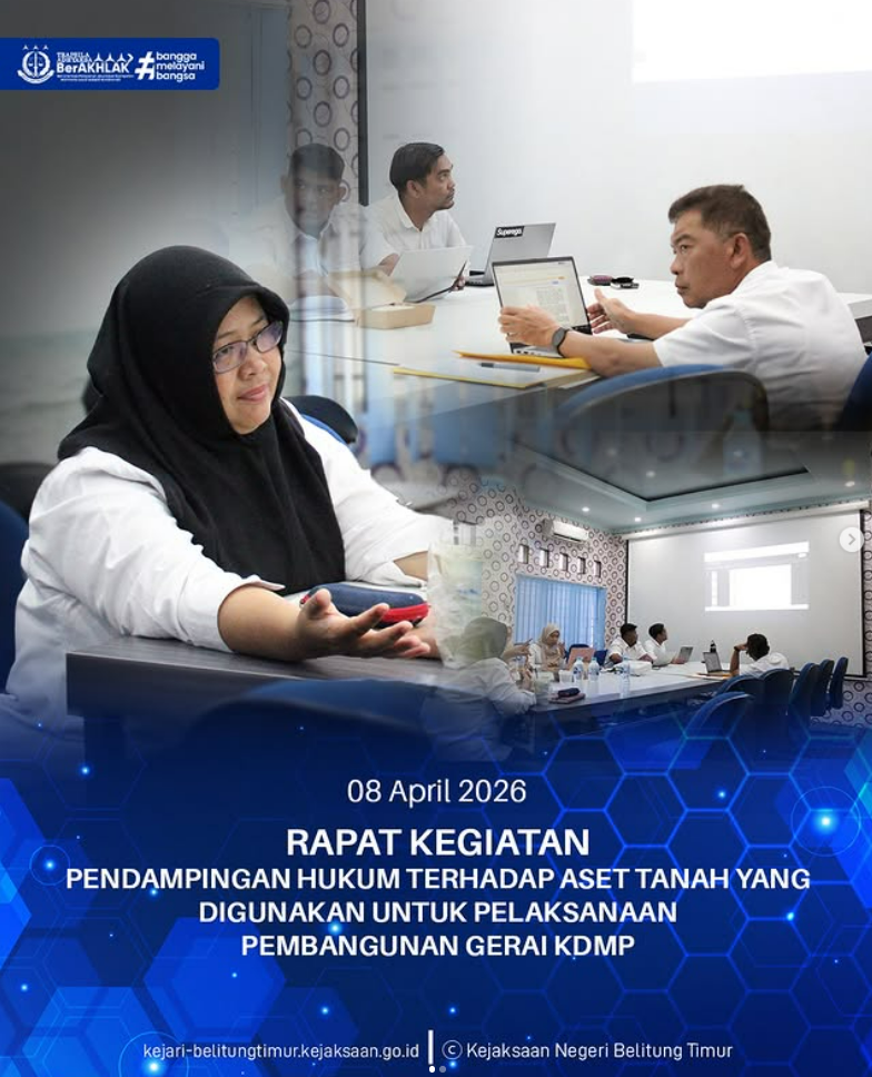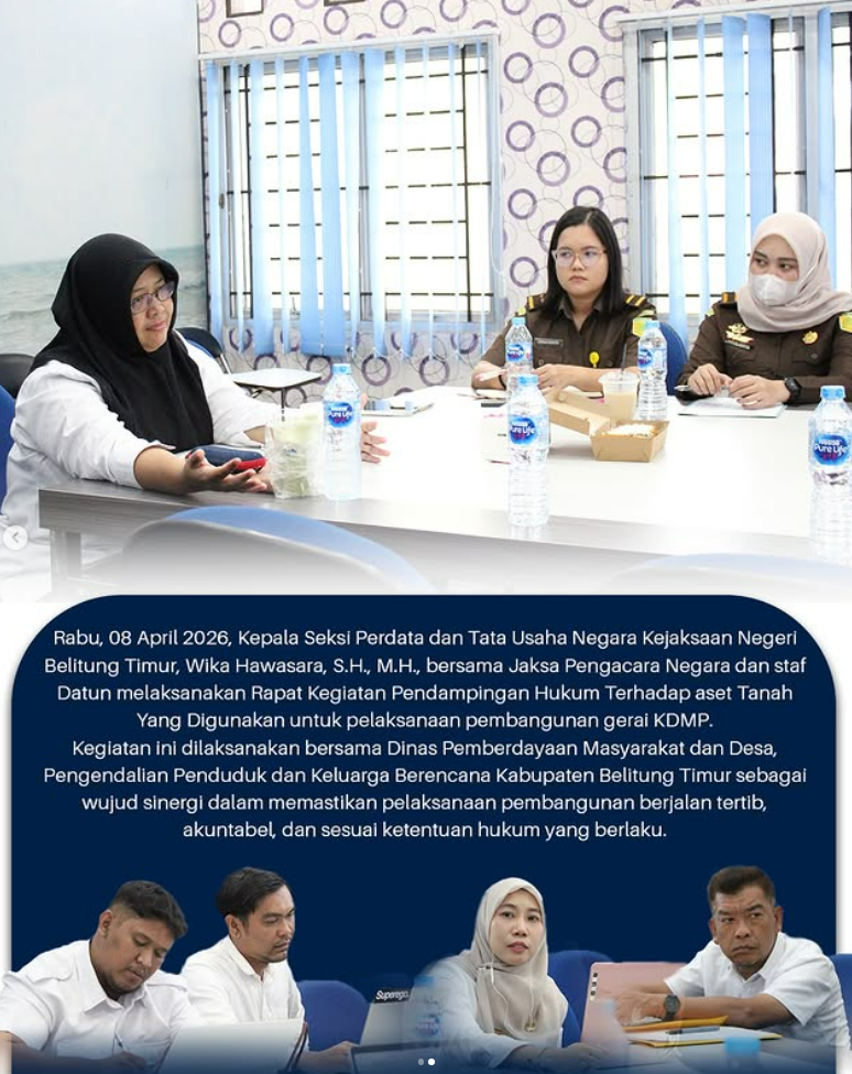 Rabu, 08 April 2026, Kepala Seksi Perdata dan Tata Usaha Negara Kejaksaan Negeri Belitung Timur, Wika Hawasara, S.H., M.H., bersama Jaksa Pengacara Negara dan staf Datun melaksanakan Rapat Kegiatan Pendampingan Hukum Terhadap aset Tanah Yang digunakan untuk pelaksanaan pembangunan gerai KDMP.