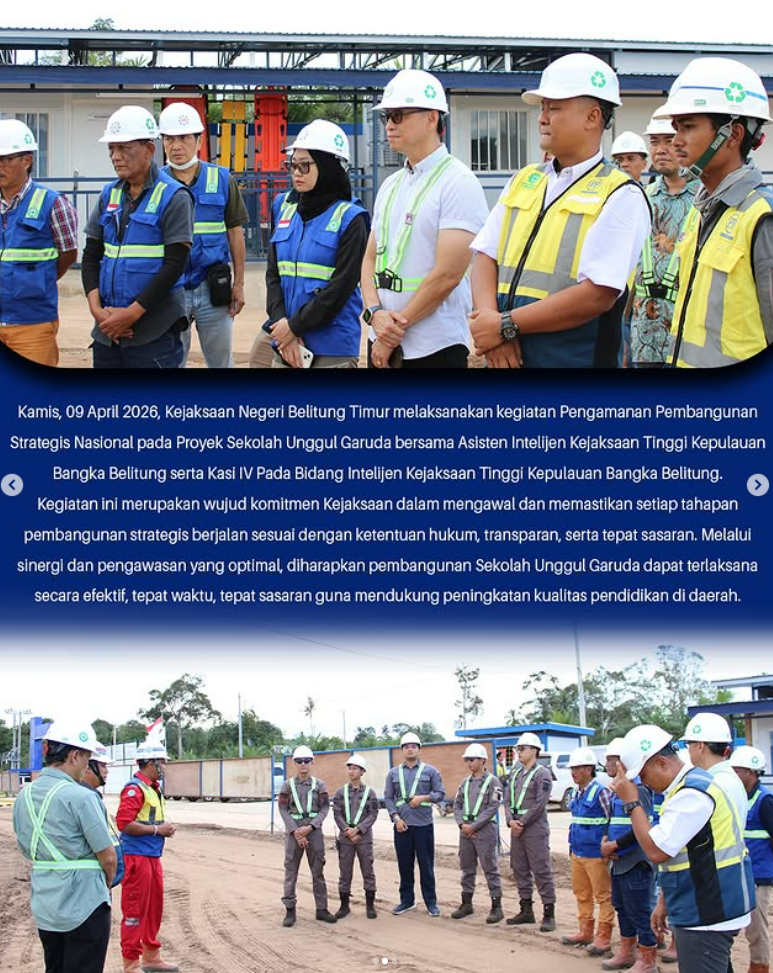 Kamis, 09 April 2026, Kejaksaan Negeri Belitung Timur melaksanakan kegiatan Pengamanan Pembangunan Strategis Nasional pada Proyek Sekolah Unggul Garuda bersama Asisten Intelijen Kejaksaan Tinggi Kepulauan Bangka Belitung serta Kasi IV Pada Bidang Intelijen Kejaksaan Tinggi Kepulauan Bangka Belitung.