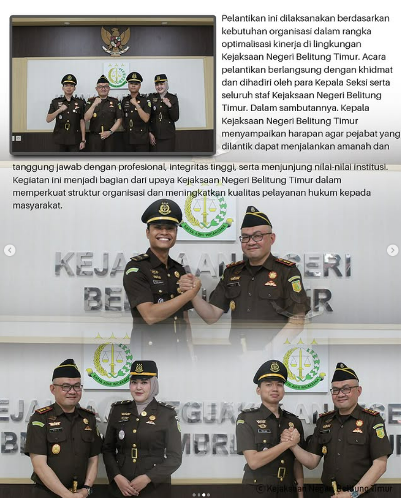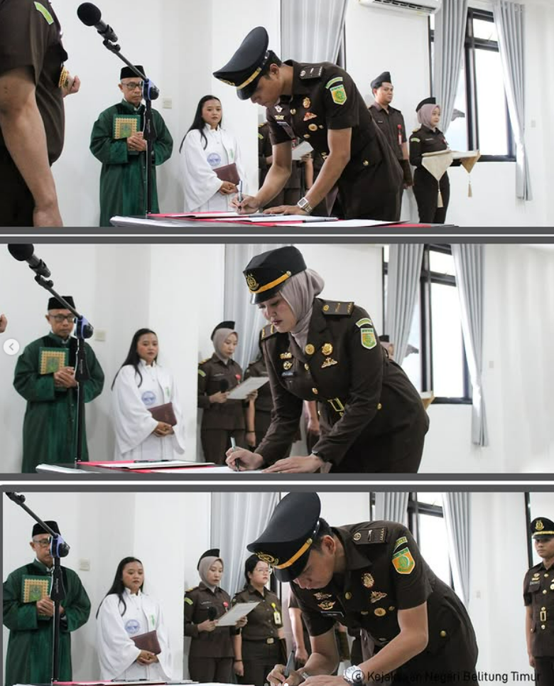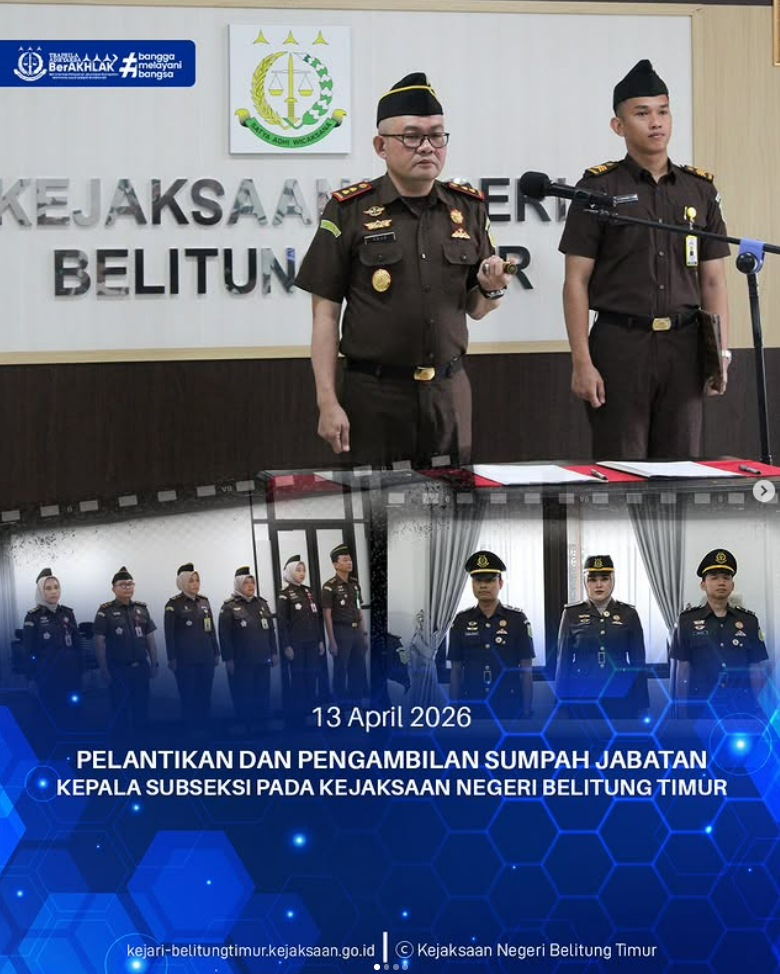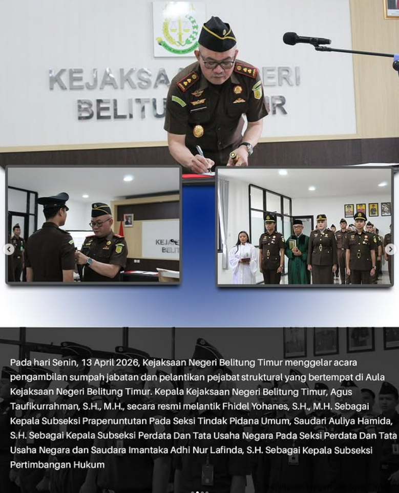 Pada hari Senin, 13 April 2026, Kejaksaan Negeri Belitung Timur menggelar acara pengambilan sumpah jabatan dan pelantikan pejabat struktural yang bertempat di Aula Kejaksaan Negeri Belitung Timur. Kepala Kejaksaan Negeri Belitung Timur, Agus Taufikurrahman, S.H., M.H., secara resmi melantik Fhidel Yohanes, S.H., M.H. Sebagai Kepala Subseksi Prapenuntutan Pada Seksi Tindak Pidana Umum, Saudari Auliya Hamida, S.H. Sebagai Kepala Subseksi Perdata Dan Tata Usaha Negara Pada Seksi Perdata Dan Tata Usaha Negara dan Saudara Imantaka Adhi Nur Lafinda, S.H. Sebagai Kepala Subseksi Pertimbangan Hukum