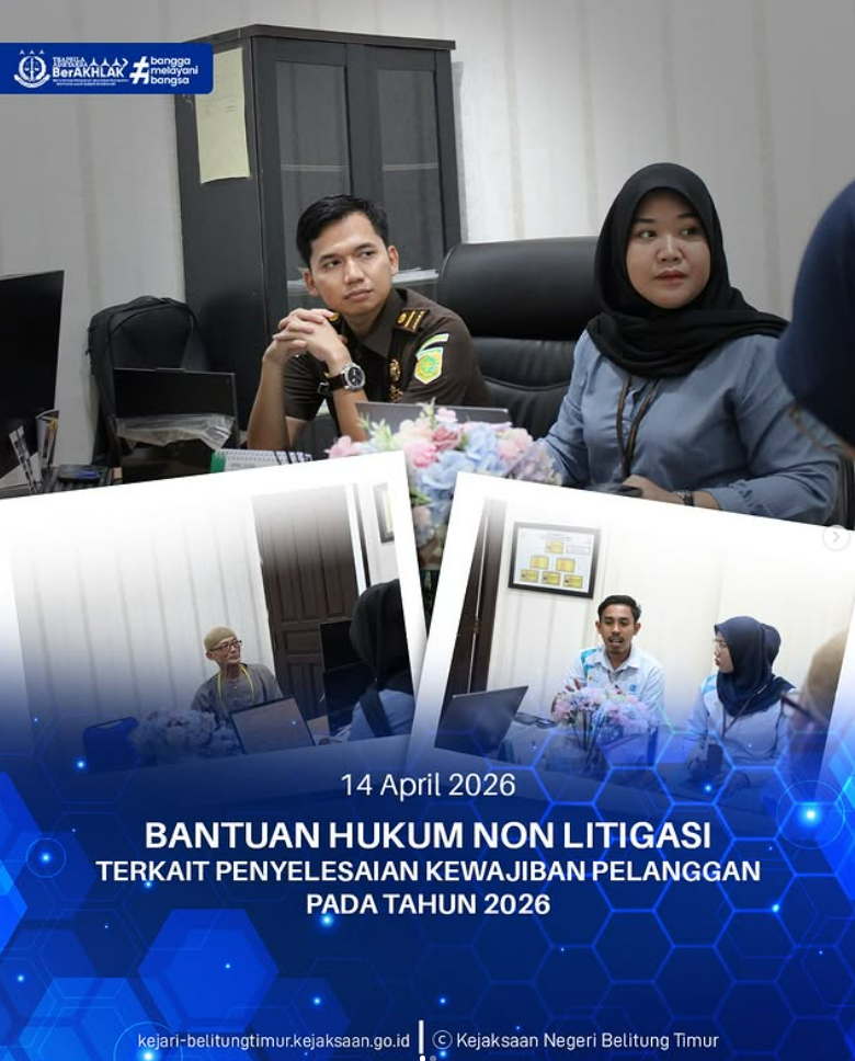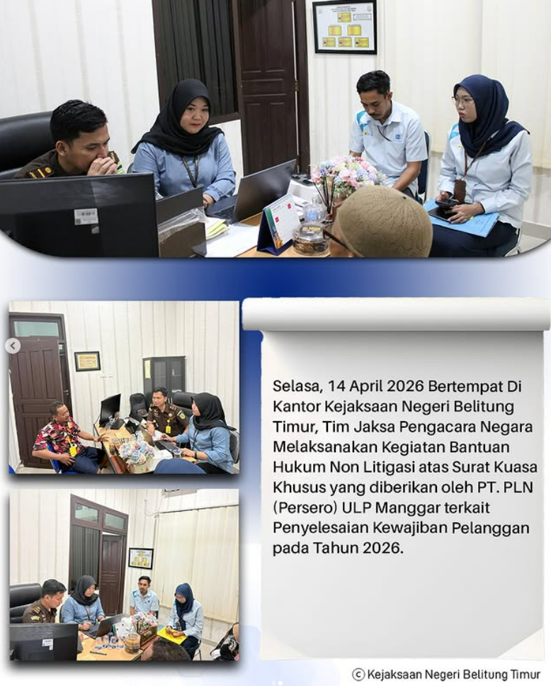 Selasa, 14 April 2026 Bertempat Di Kantor Kejaksaan Negeri Belitung Timur, Tim Jaksa Pengacara Negara Melaksanakan Kegiatan Bantuan Hukum Non Litigasi atas Surat Kuasa Khusus yang diberikan oleh PT. PLN (Persero) ULP Manggar terkait Penyelesaian Kewajiban Pelanggan pada Tahun 2026.