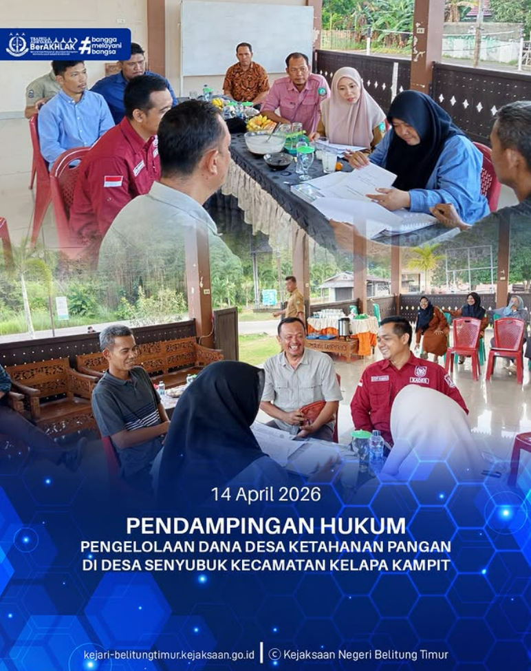 Selasa, 14 April 2026 Kejaksaan Negeri Belitung Timur mengikuti Rapat Pendampingan Hukum Kegiatan Ketahanan Pangan berupa peternakan ayam petelur Di Desa Senyubuk Kecamatan Kelapa Kampit. Kegiatan ini Bersama dengan Dinas Pemberdayaan Masyarakat dan Desa, Pengendalian Penduduk dan Keluarga Berencana Kabupaten Belitung Timur dan dihadiri oleh Jaksa Pengacara Negara Kejari Beltim Sebagai bentuk dukungan terhadap pelaksanaan program ketahanan pangan di wilayah Belitung Timur.