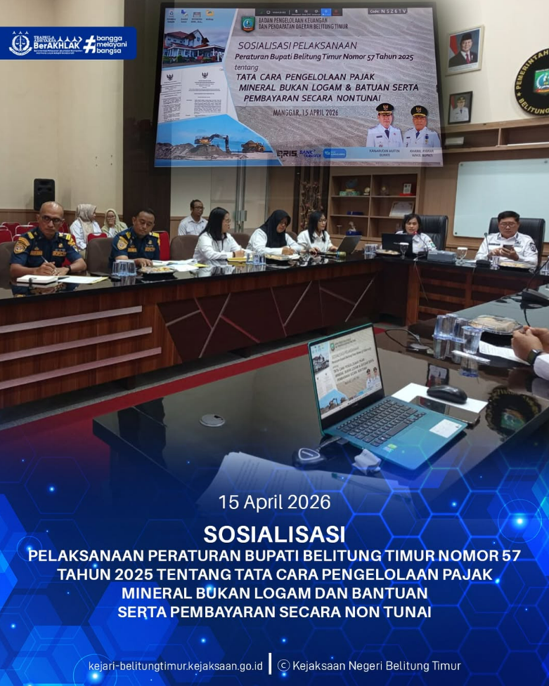 Rabu, 15 April 2026, Kepala Seksi Perdata dan Tata Usaha Negara Kejaksaan Negeri Belitung Timur, Wika Hawasara, S.H., M.H., mengikuti kegiatan sosialisasi pelaksanaan Peraturan Bupati Belitung Timur Nomor 57 Tahun 2025 tentang tata cara pengelolaan pajak mineral bukan logam dan batuan serta pembayaran secara non tunai.