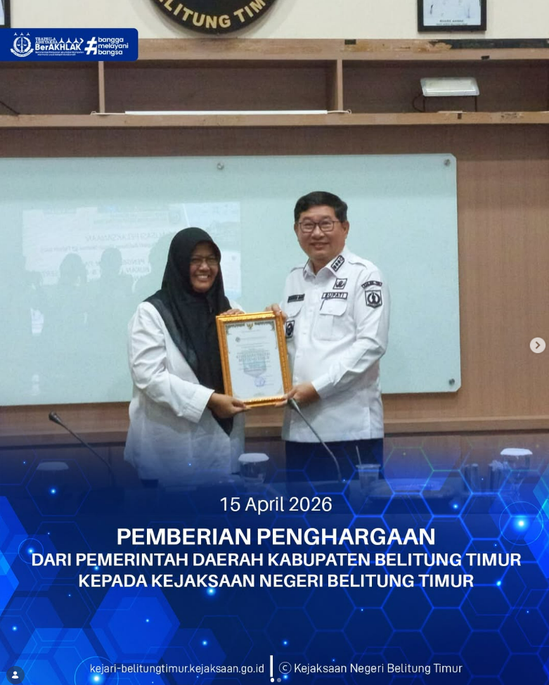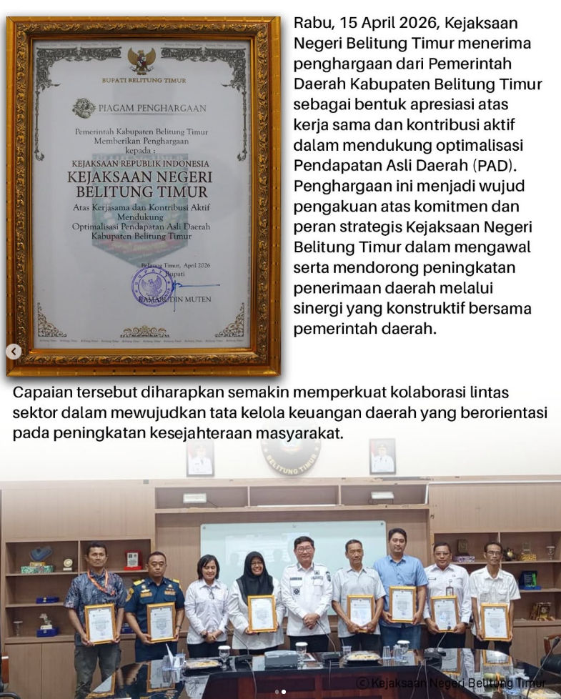 Rabu, 15 April 2026, Kejaksaan Negeri Belitung Timur menerima penghargaan dari Pemerintah Daerah Kabupaten Belitung Timur sebagai bentuk apresiasi atas kerja sama dan kontribusi aktif dalam mendukung optimalisasi Pendapatan Asli Daerah (PAD).