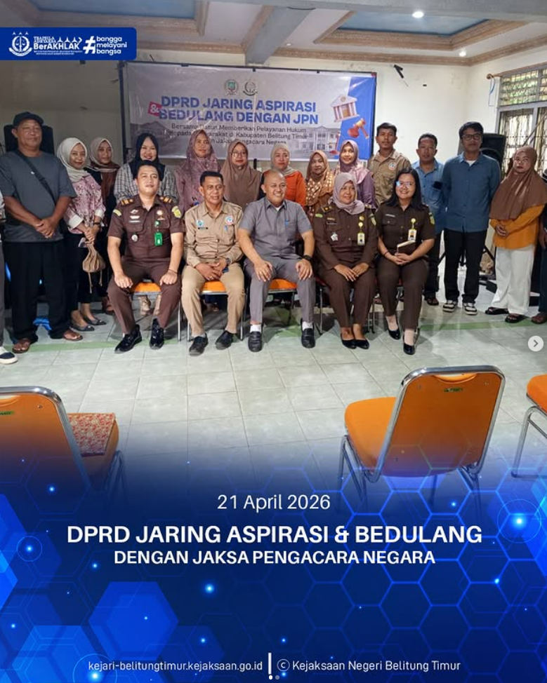 Selasa, 21 April 2026, Kejaksaan Negeri Belitung Timur melalui Bidang Perdata dan Tata Usaha Negara kembali melaksanakan kegiatan BEDULANG dengan JPN (Bersama Datun Memberikan Pelayanan Hukum kepada Masyarakat di Kabupaten Belitung Timur). Kegiatan ini diselenggarakan di Kantor Desa Lalang.