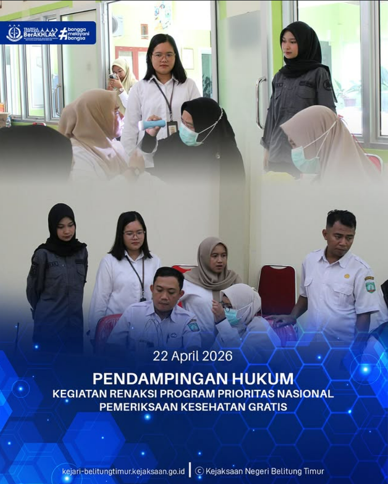 Rabu, 22 April 2026 Kejaksaan Negeri Belitung Timur melalui Bidang Perdata dan Tata Usaha Negara melaksanakan pendampingan hukum dalam kegiatan Rencana Aksi Program Prioritas Nasional berupa pemeriksaan kesehatan gratis yang diselenggarakan di Dinas Lingkungan Hidup (DLH) Kabupaten Belitung Timur.