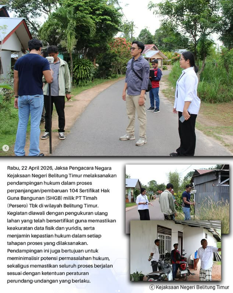 Rabu, 22 April 2026, Jaksa Pengacara Negara Kejaksaan Negeri Belitung Timur melaksanakan pendampingan hukum dalam proses perpanjangan/pembaruan 104 Sertifikat Hak Guna Bangunan (SHGB) milik PT Timah (Persero) Tbk di wilayah Belitung Timur.