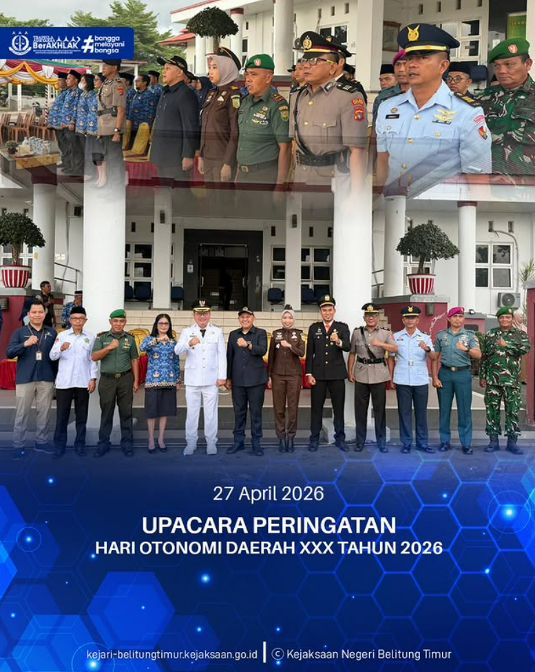 Senin, 27 April 2026, Kejaksaan Negeri Belitung Timur mengikuti Upacara Peringatan Hari Otonomi Daerah XXX Tahun 2026 dengan tema “Dengan Otonomi Daerah Kita Wujudkan Asta Cita” yang diselenggarakan di Halaman Kantor Bupati Belitung Timur.