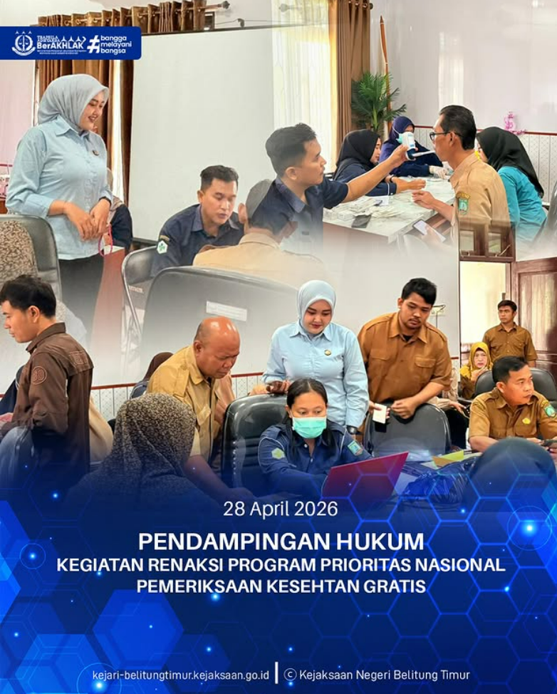 Selasa, 28 April 2026 Kejaksaan Negeri Belitung Timur melalui Bidang Perdata dan Tata Usaha Negara melaksanakan pendampingan hukum dalam kegiatan Rencana Aksi Program Prioritas Nasional berupa pemeriksaan kesehatan gratis yang diselenggarakan di Kantor Inspektorat Kabupaten Belitung Timur.