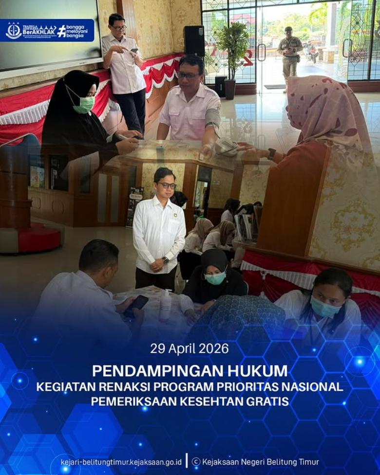 Rabu, 29 April 2026 Kejaksaan Negeri Belitung Timur melalui Bidang Perdata dan Tata Usaha Negara melaksanakan pendampingan hukum dalam kegiatan Rencana Aksi Program Prioritas Nasional berupa pemeriksaan kesehatan gratis yang diselenggarakan di Sekertariat DPRD Kabupaten Belitung Timur.