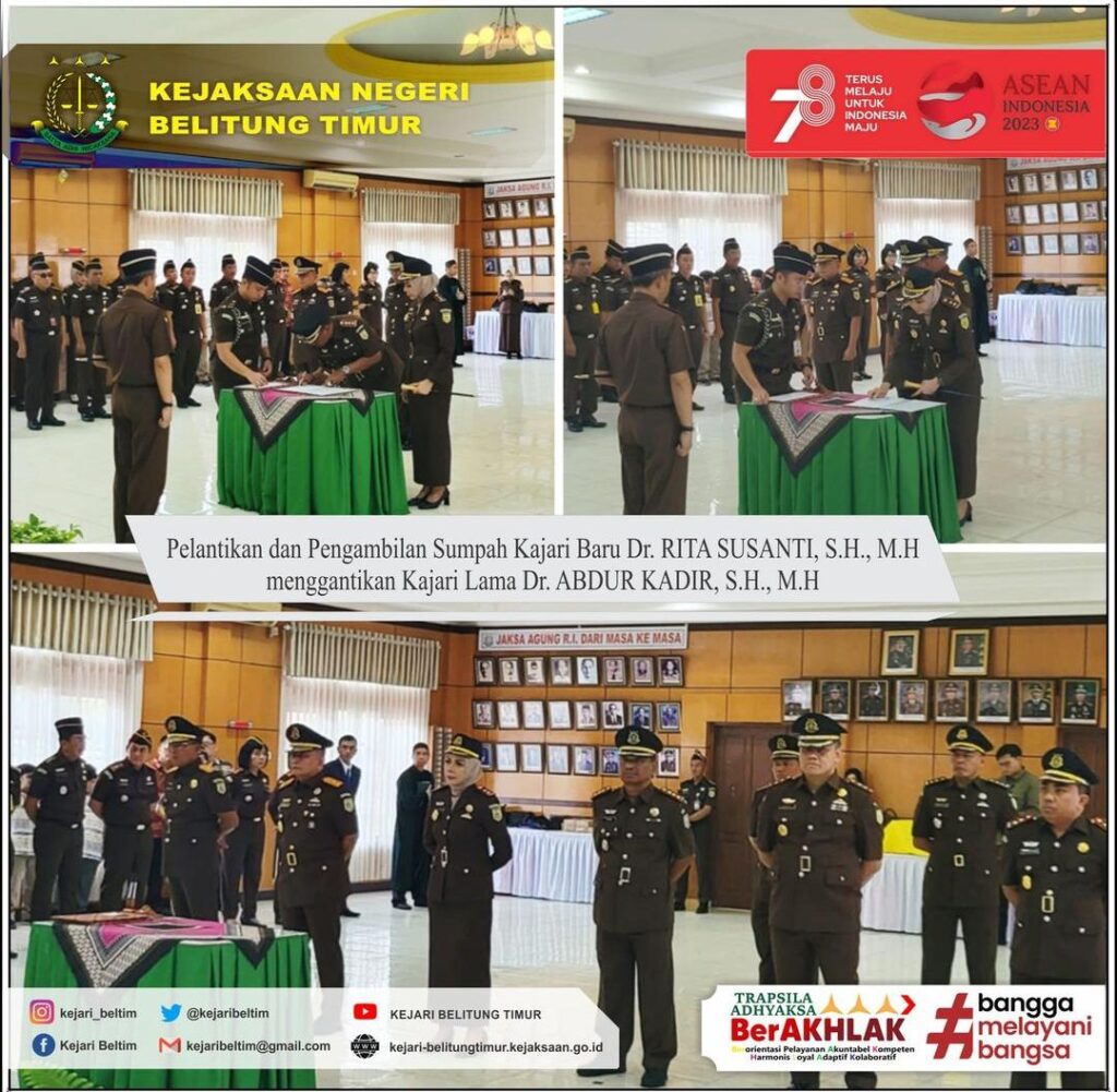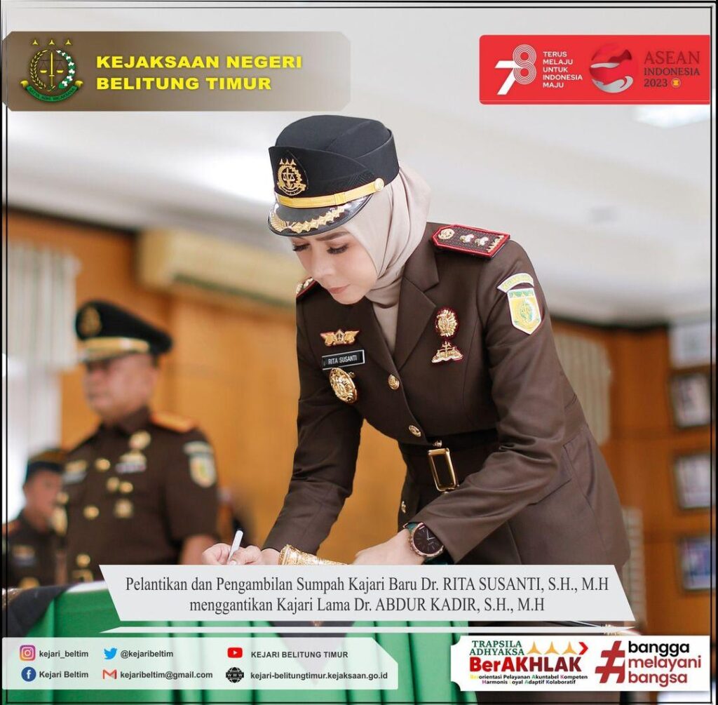 Dr. Rita Susanti, S.H., M.H. yang sebelumnya menjadi Koordinator di Kejaksaan Tinggi Sumsel diberikan tanggung jawab sebagai Kepala Kejaksaan Negeri Beltim menggantikan Dr. Abdur Kadir S.H., M.H. yang mendapat tanggung jawab menjadi Asisten Pembinaan pada Kejaksaan Tinggi Papua Barat.